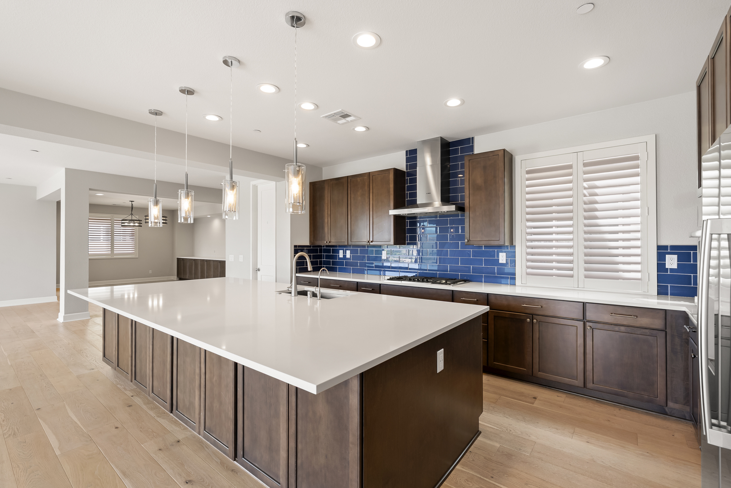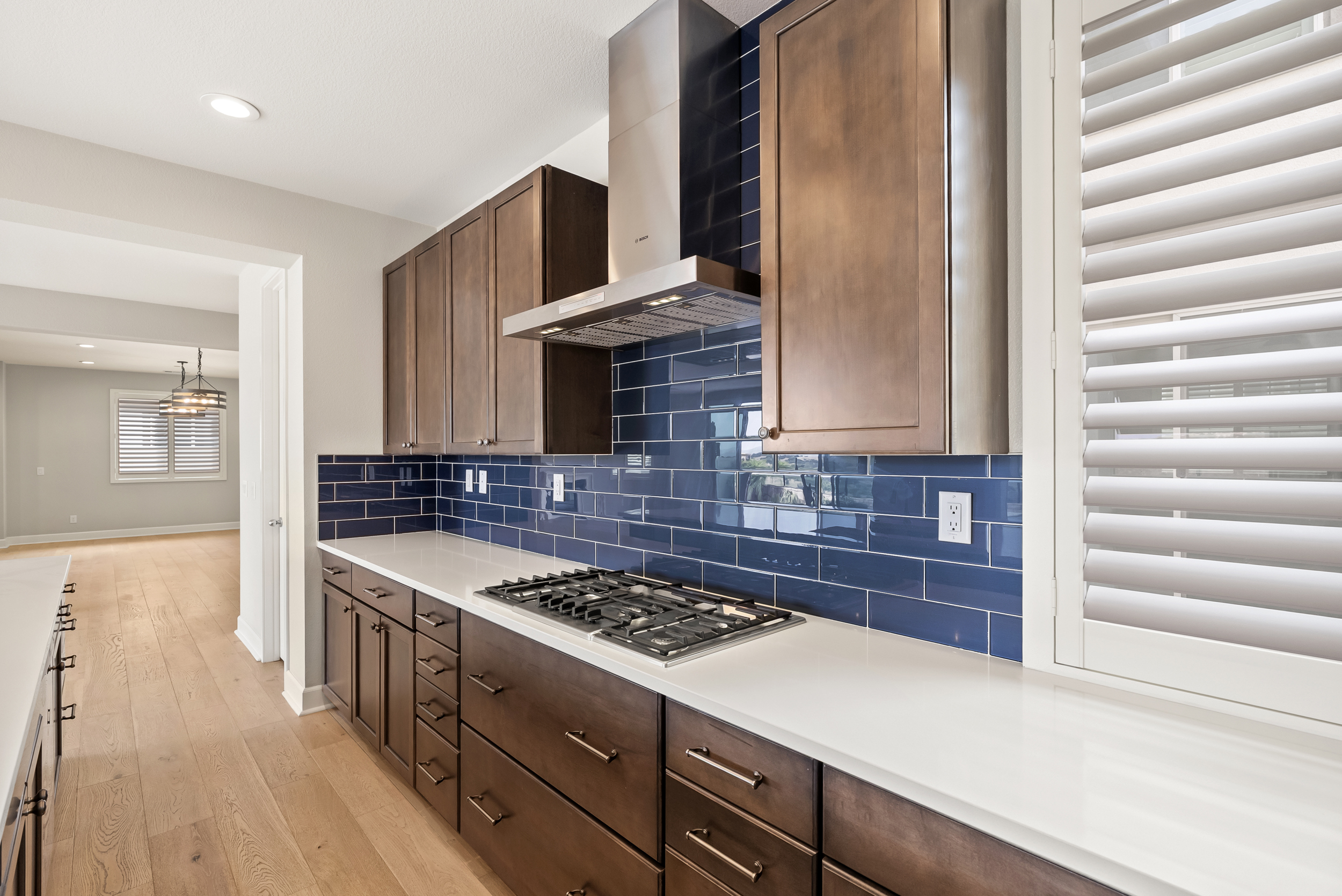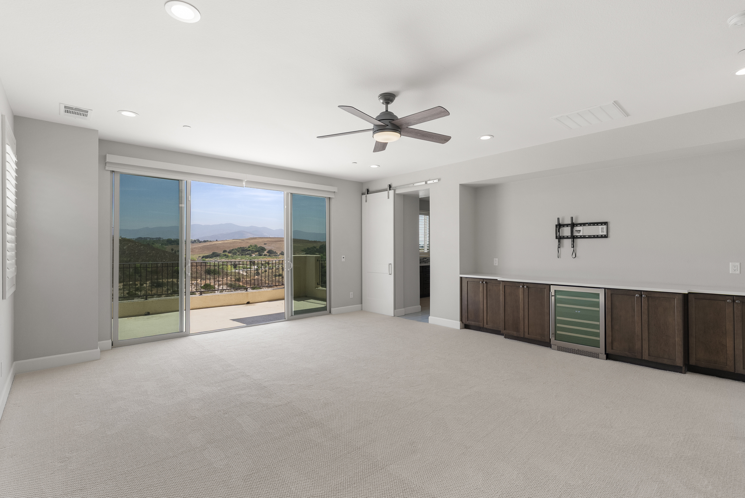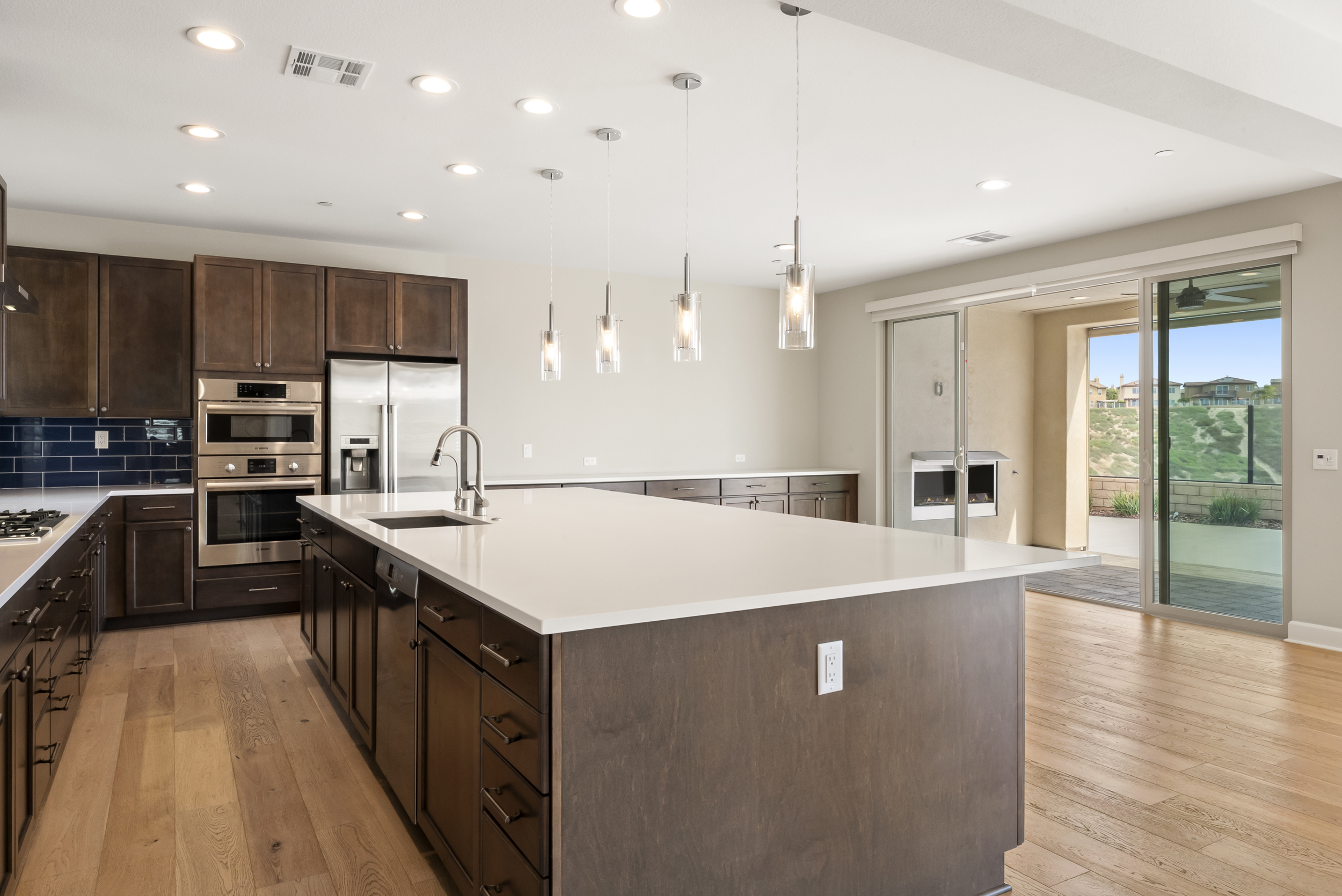 Perfectly positioned on a premier view lot with open canyon and mountain views, this extensively upgraded 5-bedroom, 4.5-bath residence offers 4,118 sq ft, an attached casita with its own private entrance, pool/spa, and owned solar with battery storage. A dramatic two-story foyer introduces volume and natural light, leading into the heart of the home, where wide-plank hardwood floors connect the kitchen, family room, and dining areas. The kitchen is centered around an expansive island and features quartz countertops, Bosch appliances, a walk-in pantry, and a spacious daily dining area. The formal dining room is scaled for larger gatherings and anchored by a built-in buffet and dedicated bar area with wine refrigerators. The family room features a gas fireplace and opens to the outdoor living areas. The attached casita offers a private exterior entrance and dedicated patio that includes an open living space, walk-in closet, bath with walk-in shower, and kitchenette and also connects to the main home. A half bath completes the main level. Upstairs, the primary suite includes built-in cabinetry with a beverage refrigerator and opens to a private deck with stunning views. The spa-inspired bath includes dual vanities, a soaking tub, an oversized walk-in shower with a bench and dual shower heads, and two walk-in closets. Two additional bedrooms share a Jack and Jill bath, and an ensuite bedroom offers its own private bath. The laundry room completes the upper level. Outdoors, the California room extends the living area, complete with fireplace, ceiling fan, recessed lighting, and motorized drop-down screens. The pool with an elevated spa and Baja entry has unobstructed views framed by glass fencing. A turfed side yard with a privacy hedge and fruit trees adds usable space. Additional features include 11.90 kW solar, a 10 kW battery, plantation shutters, motorized shades, whole-house water filtration, reverse osmosis, an epoxy garage floor, and a Tesla charger.